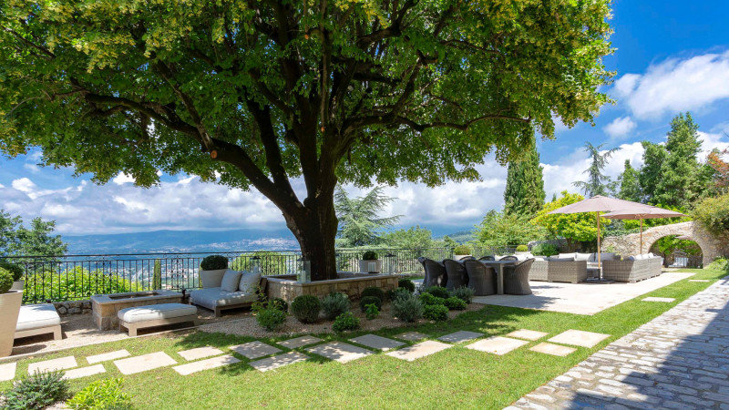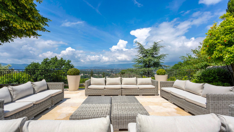 The villa features extensive landscaped gardens with a heated swimming pool, amazing views over Grasse and the valley, pool house with fireplace, firepit, bocce court, outdoor kitchen, barbecue, a four car garage and is protected by a high-end security system.