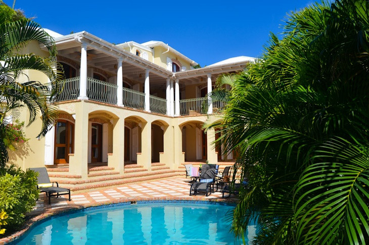 With a large, scalloped pool, plush bar pavilion, and 180-degree views of the Caribbean Sea, the terrace is ideal for evening soirees. The five king suites are private and richly appointed, and the home is completely air-conditioned.